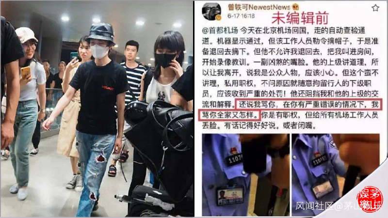 為什麼會被緊急叫停還承認給粉絲退票,事情要從6月17日曾軼可在北京首都機場的不同尋常的經歷説起:當天,從國外飛回國的曾軼可稱,在機場遭到邊檢工作人員的刁難,“被對方要求摘掉帽子過檢”,這讓她很不開心,於是在微博上指責對方“蠻不講理、私用職權”,在第一次的微博內容上,她表示“還説我罵你,在你有嚴重錯誤的情況下,我罵你全家又如何?”,當天她又以“九宮格”形式曝光民警未打碼的證件照,引發熱議。