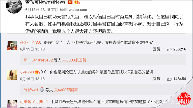 看看官媒紛紛發聲對曾軼可不當行為的譴責與批評,當天(6月19號)當事人曾軼可在微博上道歉,稱“我承認自己前兩天言行失當,難以相信自己當時竟是如此情緒化。在這裏我向所有人致歉,如果有機會我也願意對當事警官當面説聲對不起。對於自己這一行為造成的影響,我願以個人最大能力承擔後果。 ”不過,網友似乎對她的道歉並不認同,認為她沒有誠意。
