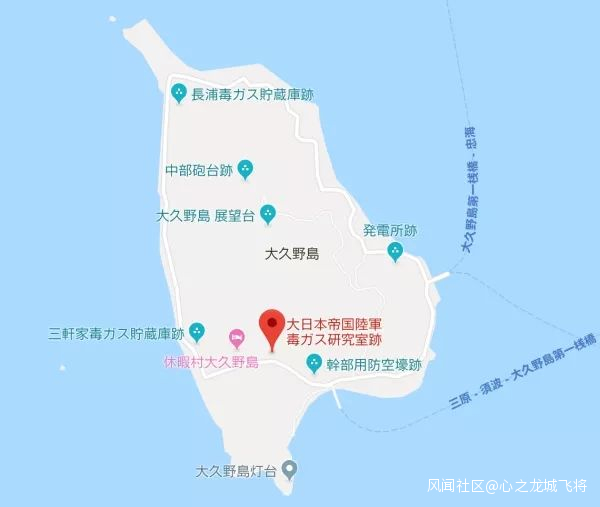 如果在大久野島上打開手機地圖app,你會發現許多“非常刺眼”的名字出現地圖上,“大日本帝國陸軍毒氣研究室遺址”、“三軒家毒氣儲藏庫遺址”、“長浦毒氣儲藏庫遺址”,還有發電廠,炮台遺蹟和防空戰壕的遺蹟標誌等等。