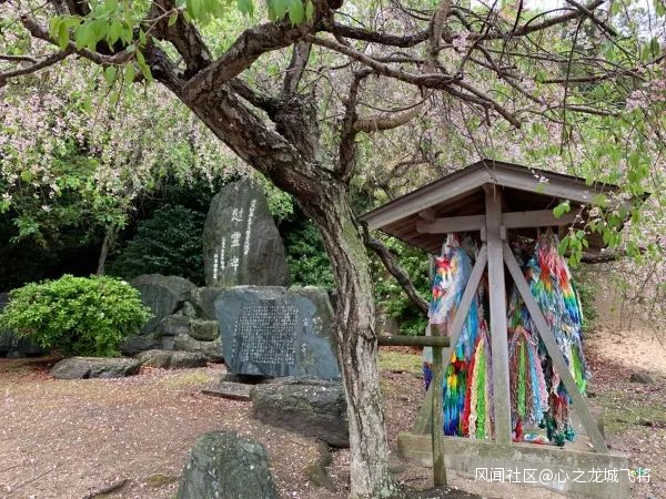 紀念大久野島毒氣受害遇難者的慰靈碑,旁邊是訪島遊客送上的千紙鶴。澎湃見習記者王昱圖