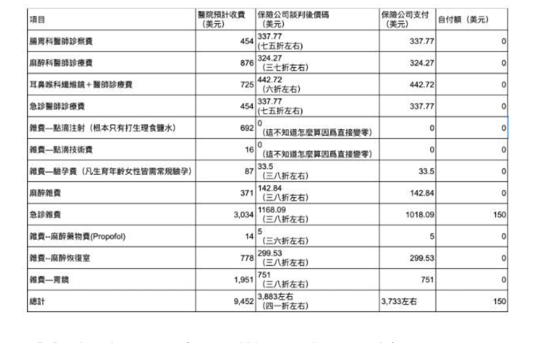 因此,答案揭曉:這個「夾魚刺」,醫院預計收費 9,452 美元(約新台幣 29.6 萬元),保險公司幫忙談判到四折左右,也就是 3,883 美元(約新台幣 12.1 萬元)!