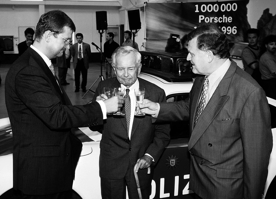 這是1996年魏德金(左)在向費裏敬酒,祝賀第100萬輛保時捷下線