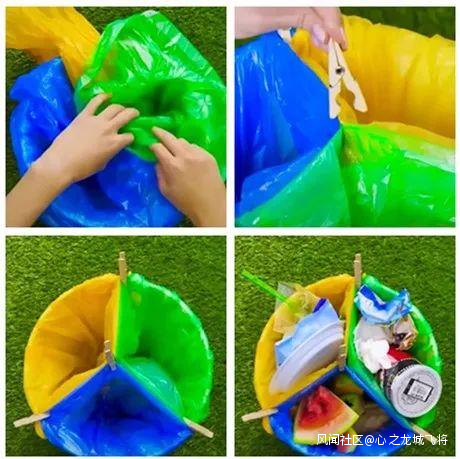 只需準備四個夾子,各邊固定住,就能自制一個三分類的垃圾桶。