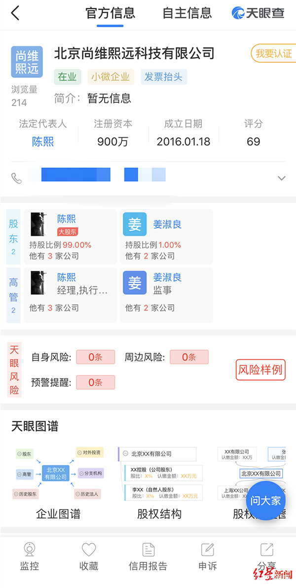 紅星新聞記者查看“影漫小天使”公眾號後發現,該公眾號主體為“北京尚維熙遠科技有限公司”。紅星新聞其工商信息後發現,其公司法人為陳熙,疑為上述文章的作者。
