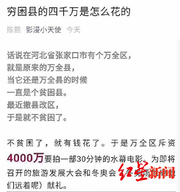 紅星新聞記者查閲原文後發現,文章作者名為陳熙。而文章大意為,曾屬河北省貧困縣的萬全縣在撤縣改區後成為了河北省張家口市萬全區。近期,萬全區以獻禮旅遊發展大會和冬奧會為由,斥資4000萬拍攝了一部30分鐘的水幕電影。該項目經過層層外包,依次經手“嚴聚、方旖旎、劉金濤、汪海洋、李梁”後,由導演陳熙落實拍攝。但陳熙在文章中聲稱,在近兩個月的製作後,自己“一分錢也沒拿到”,直今項目方仍拖欠其4萬5千元款項,遂實名舉報相關情況。