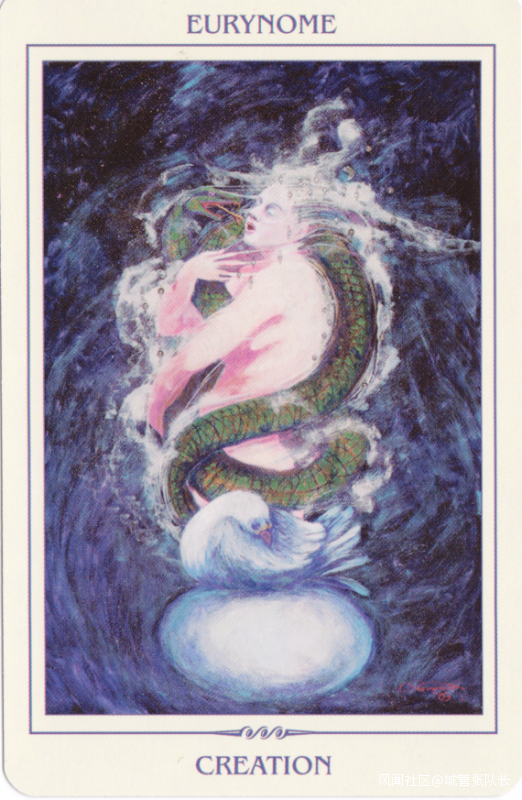 一則希臘土著皮拉基人的早期神話稱,世界萬物是由一位女神創造的。創世之初只有不定形狀的混沌巨人卡俄斯,為大洋之神歐西努斯所環繞。大女神歐律諾墨(Eurynome)誕生於混沌之時,現身於虛無之中,她創造了水,在水中嬉戲時,她的情緒生成了風。她又用這些材料給自己創造了一個夥伴:巨蛇俄菲翁(Ophion)。蛇環繞着她,她後來變成了一隻鴿子,併產下一個蛋,蛋中孕育了萬物。後來她發現那條蛇驕傲起來,就把它打入地下。之後,她與北風生下了愛神厄洛斯(Eros)。再後來,她在俄刻阿諾斯的波濤之上跳舞,以此創造了她可以在其上漫步的大地。