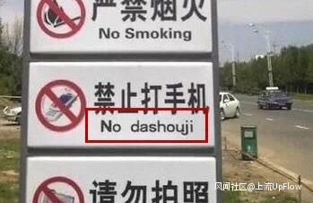 “no"一詞的精準翻譯,充分表達了作者對這一行為的抵制。而"dashouji**”**中,聲母與韻母的完美搭配,又使這條外文翻譯增添了國風韻味與方言特色。中西結合,在遼闊背景中區別於周圍其他翻譯,如夢如幻如真,操作難度高達99.9(duibuqi上流君實在編不下去了……
