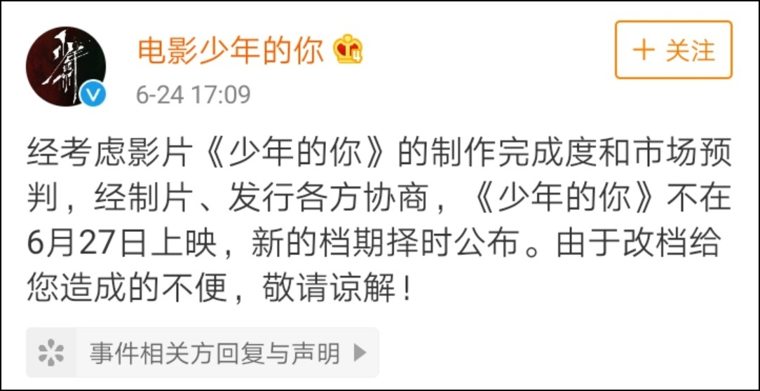 直到下午5時09分許,《少年的你》官微正式發文證實撤檔消息,並稱考慮到影片的製作完成度和市場預判,製片和發行各方協商,不在6月27日上映,新的檔期仍然有待公佈。對於改檔,電影官微也向觀眾表示抱歉。
