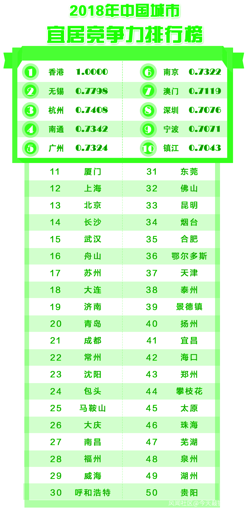 此外,無錫、杭州、南通、廣州、南京、澳門、深圳、寧波和鎮江位居分列第二至第十名,廈門、上海、北京等城市位居第十一到第十九名,青島排名位列第二十。
