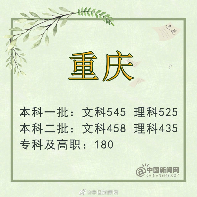 23日,重慶市公佈2019年全國普通高校各類招生錄取最低控制分數線。第一批本科文史類545分、理工類525分;第二批本科文史類458分、理工類435分;文高職專科批:180分。