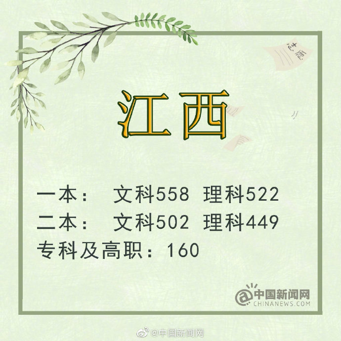 6月23日,江西省2019年高考分數線公佈:第一批本科文史類558分、理工類522分;第二批本科文史類502分、理工類449分;文史、理工類高職(專科):160分。