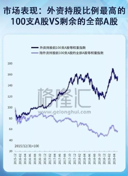 近日,有媒體根據外資持股比例最高的100只A股和剩餘的全部A股,分別編制了等權重指數,結果顯示兩個指數自2016年至今的市場表現大相徑庭。