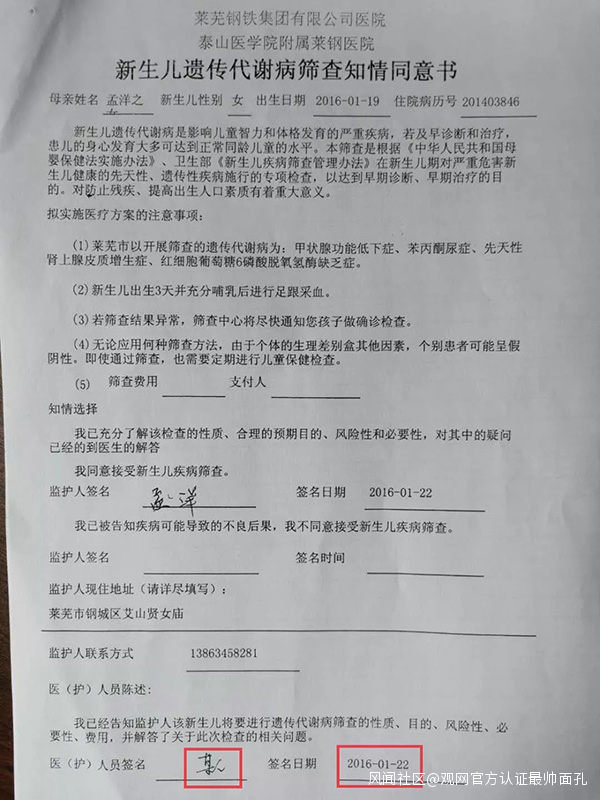 符律師將5月和6月的兩份病歷進行比對,進而發現了更多問題,“這兩份病歷有很多處不同,有的內容5月的病歷有,6月的病歷沒有,有的內容6月的病歷有,5月的病歷沒有,不清楚是否刻意篩選過病歷。另外就是陳建利的簽名,陳建利的筆跡還是比較容易辨認的,但有一些簽名可以明顯看出與他本人筆跡差異較大,懷疑非本人簽字,特別在一份《新生兒遺傳代謝病篩查知情同意書》上,我們發現醫護人員簽名欄填寫的是‘某人’,甚至曾考慮過是不是哪位醫護人員名字就叫‘某人’,而且這份同意書的簽名日期是2016年1月22日,可孩子在1月21日已經死了。”