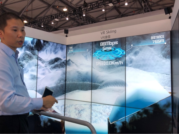 這是一款基於5G網絡實時渲染的滑雪體感遊戲,玩家站在屏幕前方的滑雪台上,通過身體的晃動來模擬真實的滑雪體驗,而屏幕的畫面則通過5g網絡實時渲染。我上去體驗了一把,雖然還在調試階段,但是遊戲給我帶來的刺激感已經很棒了。