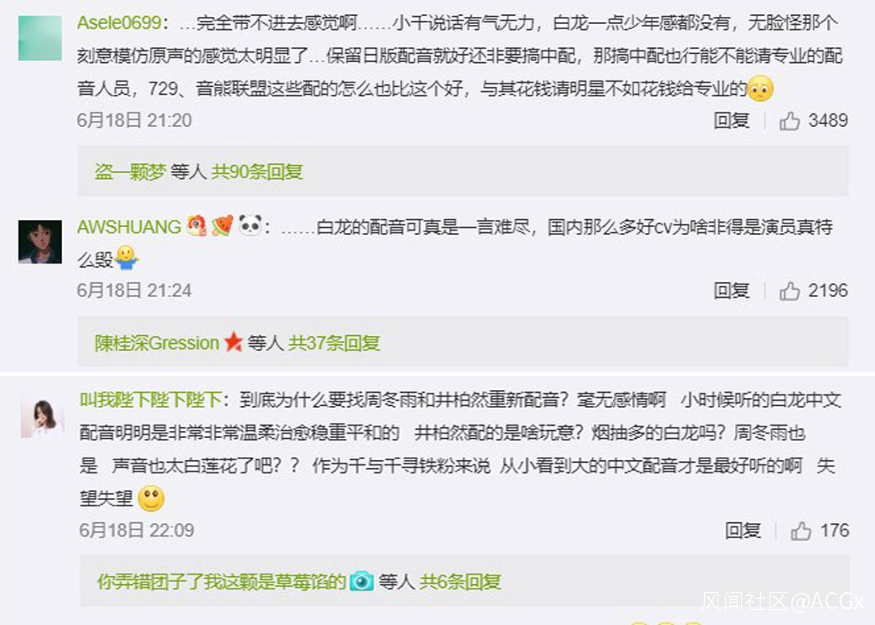 “配音沒有角色代入感”“周冬雨像捏着嗓子説話”“白龍配音聲線太老”“更喜歡原音……”“也就無臉男和湯婆婆的配音還行”《千與千尋》的粉絲紛紛在社交平台留言,表示了自己對中配預告的態度。
