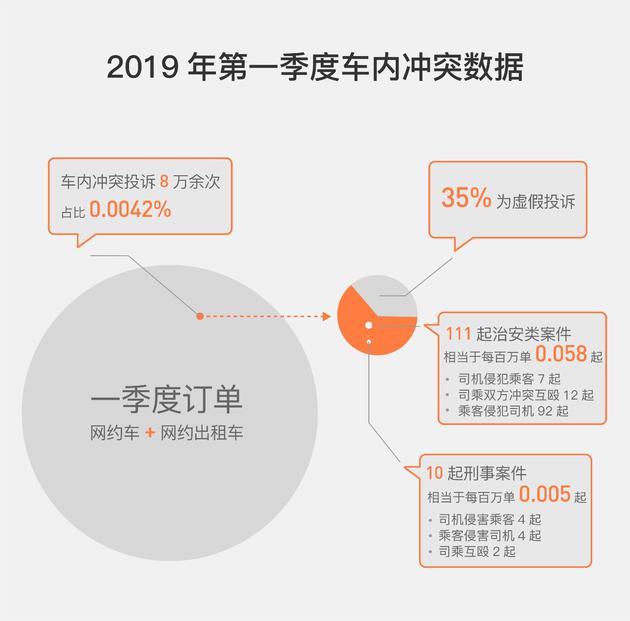 2019年第一季度,滴滴網約車和網約出租車共收到來自司乘雙方關於車內糾紛衝突的安全進線8萬次,約佔二者訂單總和的0.0042%。8萬次投訴中,35%以上都是虛假投訴。