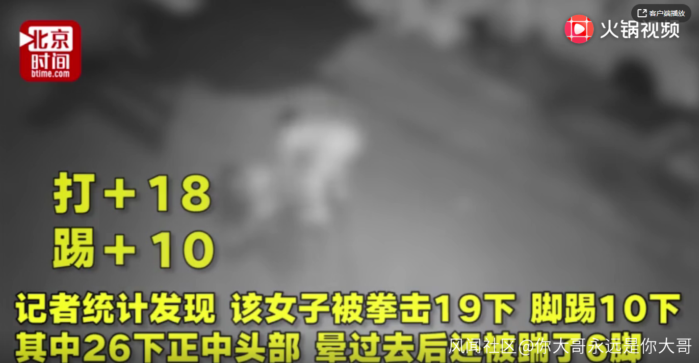 原視頻中,男子的每一下踢打,動作幅度極大,都可以清晰地聽到聲音。29次擊打中有26下擊打正中頭部,女子暈厥過去後,男子還出現撕扯女子短裙的舉動。