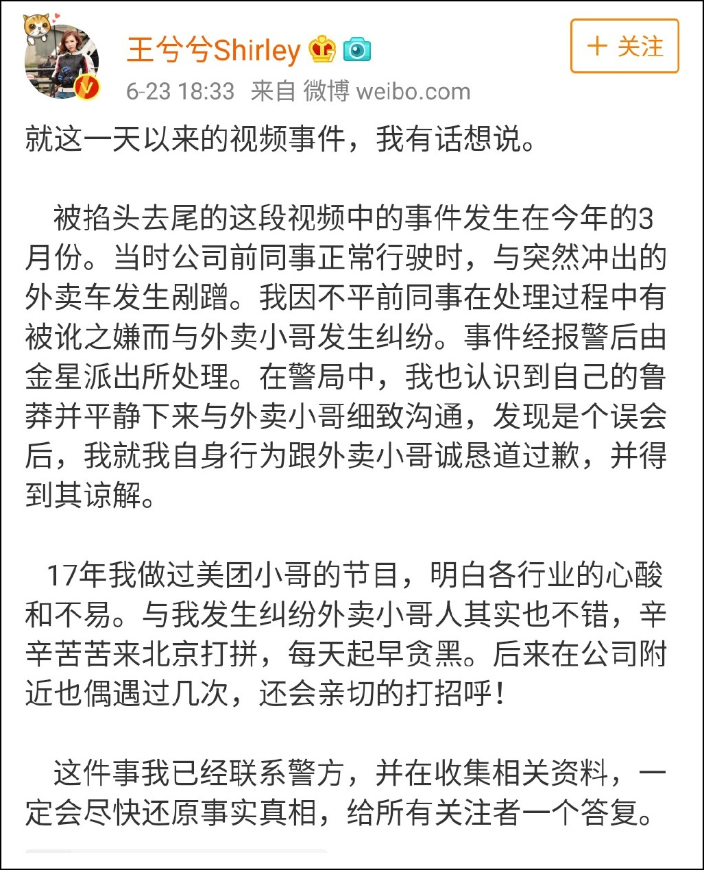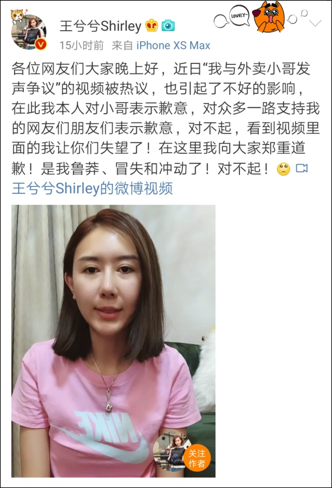 王茜麟這邊也在深夜發視頻道歉,她稱自己已經認識到了其言行的不得體,很魯莽、衝動,向外賣小哥、社會大眾鄭重道歉。