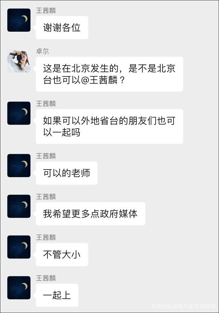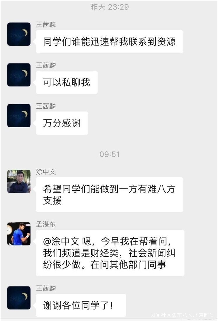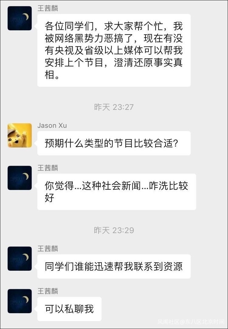 在這份聊天截圖中,王茜麟認為自己是被網絡惡勢力惡搞了,對於希望能夠上的媒體也不限範圍,“不管大小一起上”。有同學以自己所處頻道專做財經類新聞,不做社會新聞為由拒絕了。另外也有同學喊話:一方有難,八方支援。