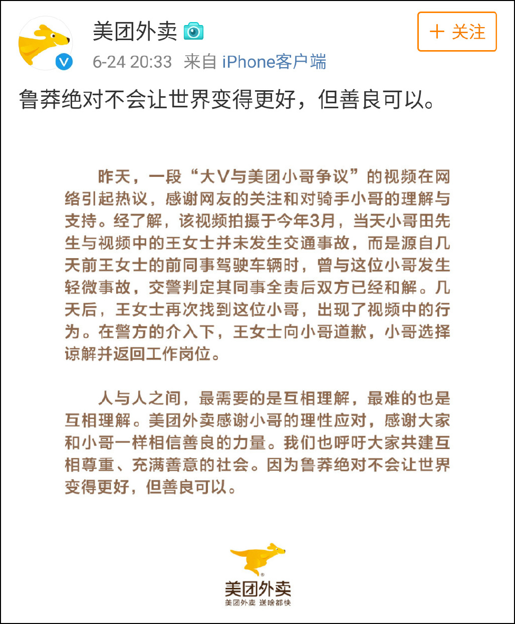 而在昨晚8時30分許,美團外賣的官方微博發佈回應稱: