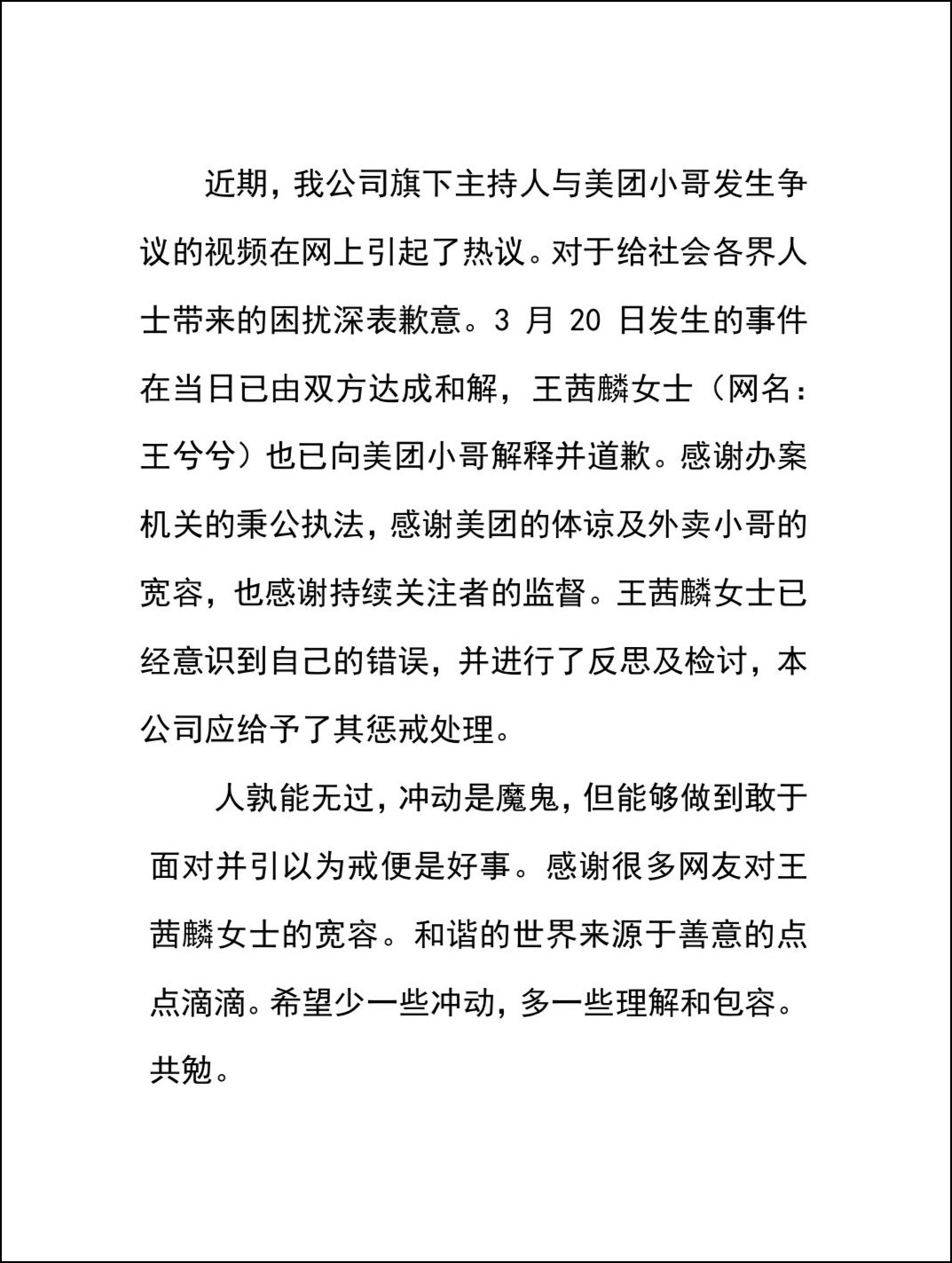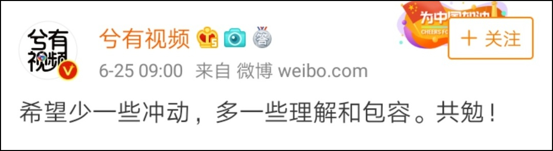 其所屬公司也在今早發文道歉,希望能夠少一些衝動,多一些理解和包容。
