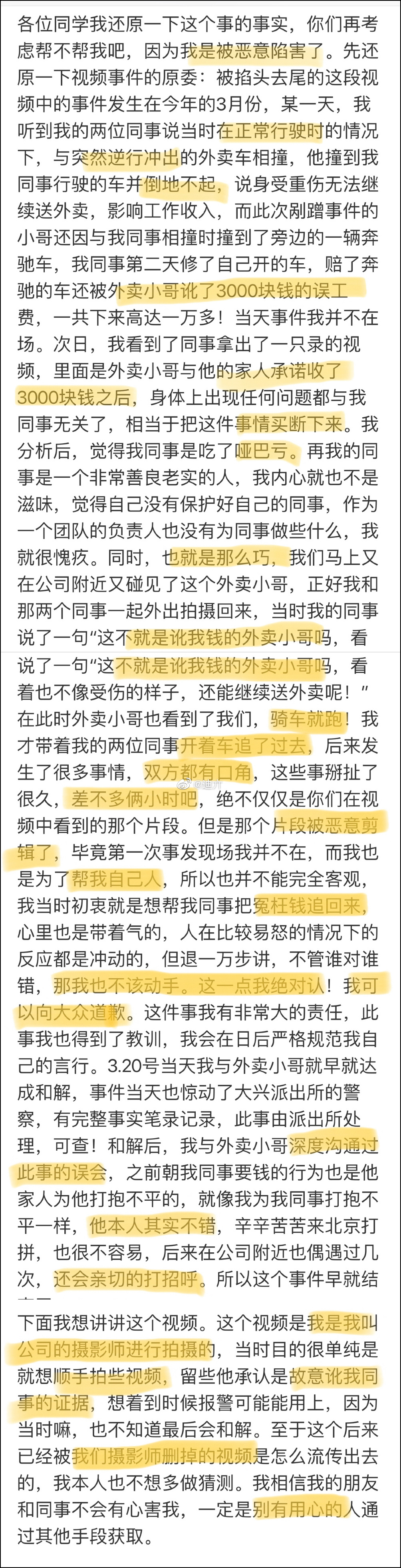 經瞭解,該視頻拍攝於今年3月,當天外賣小哥田先生與視頻中的王女士並未發生交通事故,而是幾天前王女士的前同事駕駛車輛時,曾與這位外賣小哥發生輕微事故,交警判定其前同事負全責,雙方和解。幾天後,王女士再次找到該外賣小哥,出現上述視頻中的行為。目前,在警方的介入下,王女士已經向小哥道歉,小哥選擇諒解並返回工作崗位。