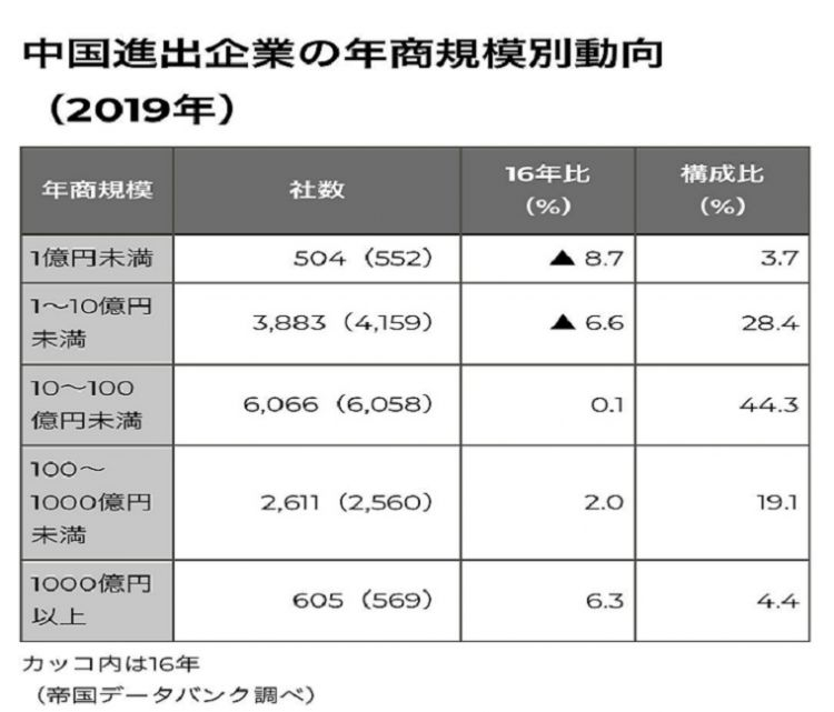 自去年開始,受中美貿易摩擦的影響,大型製造企業、批發業重新調整了與中國企業的貿易往來,部分企業將生產工廠轉移至東南亞國家。調查預測,今後包含大型企業在內,進駐中國市場的日本企業數量將會進一步減少。