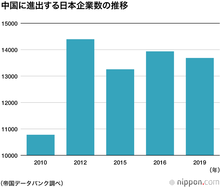 2010年進軍中國的日本企業為1萬778個,2012年為1萬4394個,2015年為1萬3256個,2016年為1萬3943個。2019年為1萬3685個,與過去最多的2012年相比減少了709個。