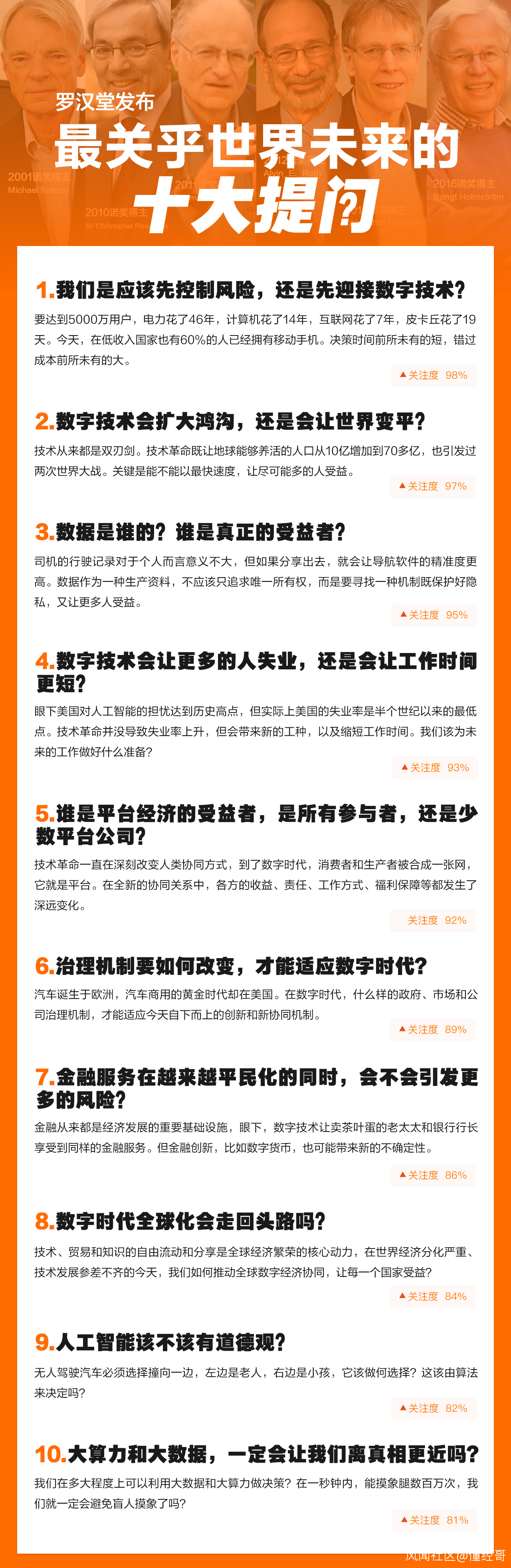 25日,阿里巴巴倡議成立的羅漢堂發佈最關乎人類未來的十大問題。200多位來自全球的頂尖學者、政界、企業界負責人應邀在杭州“西湖論劍”,閉門研討十大問題,其中包括6位諾貝爾經濟學獎獲得者。