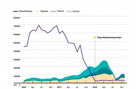 美國、歐洲、日本、韓國等國家開始把目光轉向了馬來西亞等東南亞國家。綠色和平組織最近的一份報告發現,2018年前7個月,美國向馬來西亞出口的塑料廢物比上一年增加了一倍以上。泰國2018年接收的美國垃圾也比前一年多出了三倍。