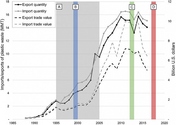 《科學進展》(Science Advances)2018年發佈的報告指出,1993到2016年,全球垃圾年進口量增加了723%,出口量則增加了817%。僅2016年一年,就有123個國家出口了1410萬公噸塑料垃圾用於回收利用,其中中國接收了來自43個不同國家的735萬公噸塑料垃圾,佔比超50%。