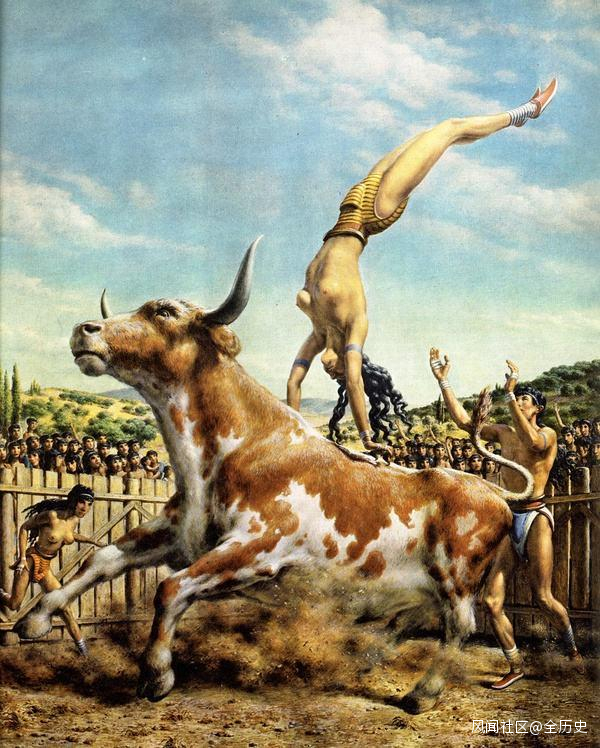 並且,可能是出於宗教原因,年輕的米諾斯男女喜歡錶演有生命危險的雜技。他們輪流從衝過來的公牛的角上跳過去。跳完舞后,他們把公牛宰殺了,把血撒在大地上獻神。即使很少有人在跳過這種舞后能活下來,他們仍樂此不疲……