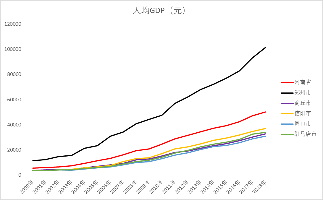 那麼河南就那麼慘嗎?倒也不是,無論是全省還是其他城市人均GDP,都沒出現過這種情況。