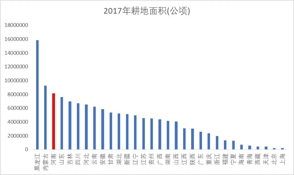 論中國大陸省級行政區耕地面積,河南省2017年以811.2萬公頃排在第三,僅次於黑龍江和內蒙古。可是黑龍江和內蒙古人口密度都沒有河南大,人地緊張的關係並沒有河南這麼突出。
