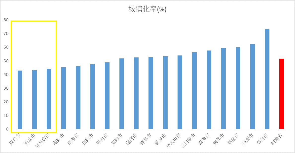 還有一個指標,城鎮化率,可以説明黃淮地區在河南省內相對不發達的地位。