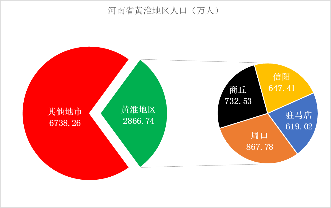 然而這一地區常住人口其實共有2866.7萬人,相當於近億河南常住人口的將近三成,其他14個地級市人口加一起才佔河南省七成。其中周口和商丘常住人口數僅次於鄭州和南陽,位列省內第三和第四,信陽和駐馬店常住人口數也超過600萬人,位列省內第六和第七。