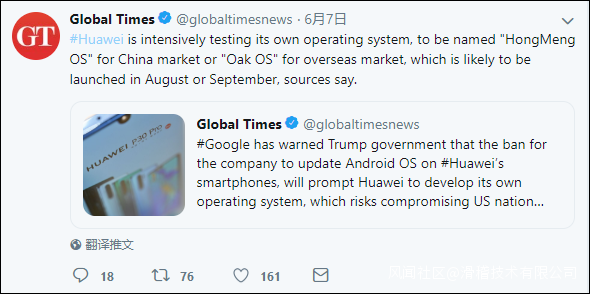 6月7日,環球時報在其官方推特發文稱,據消息人士透露,華為正在加緊測試新款操作系統,該操作系統在國內市場被命名為“鴻蒙OS”,在海外市場被命名為“Ark OS”,或將於8月份或9月份推出。