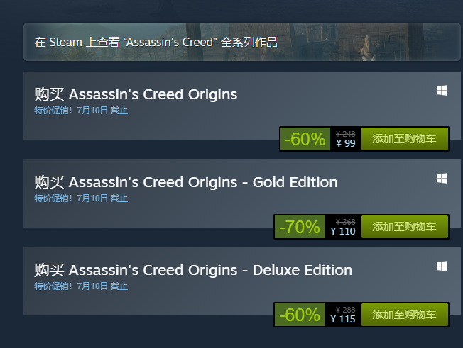 包括豪華版全部內容以及後續DLC季票的《刺客信條起源》打了3折,比起只打4折的豪華版還便宜了5塊…