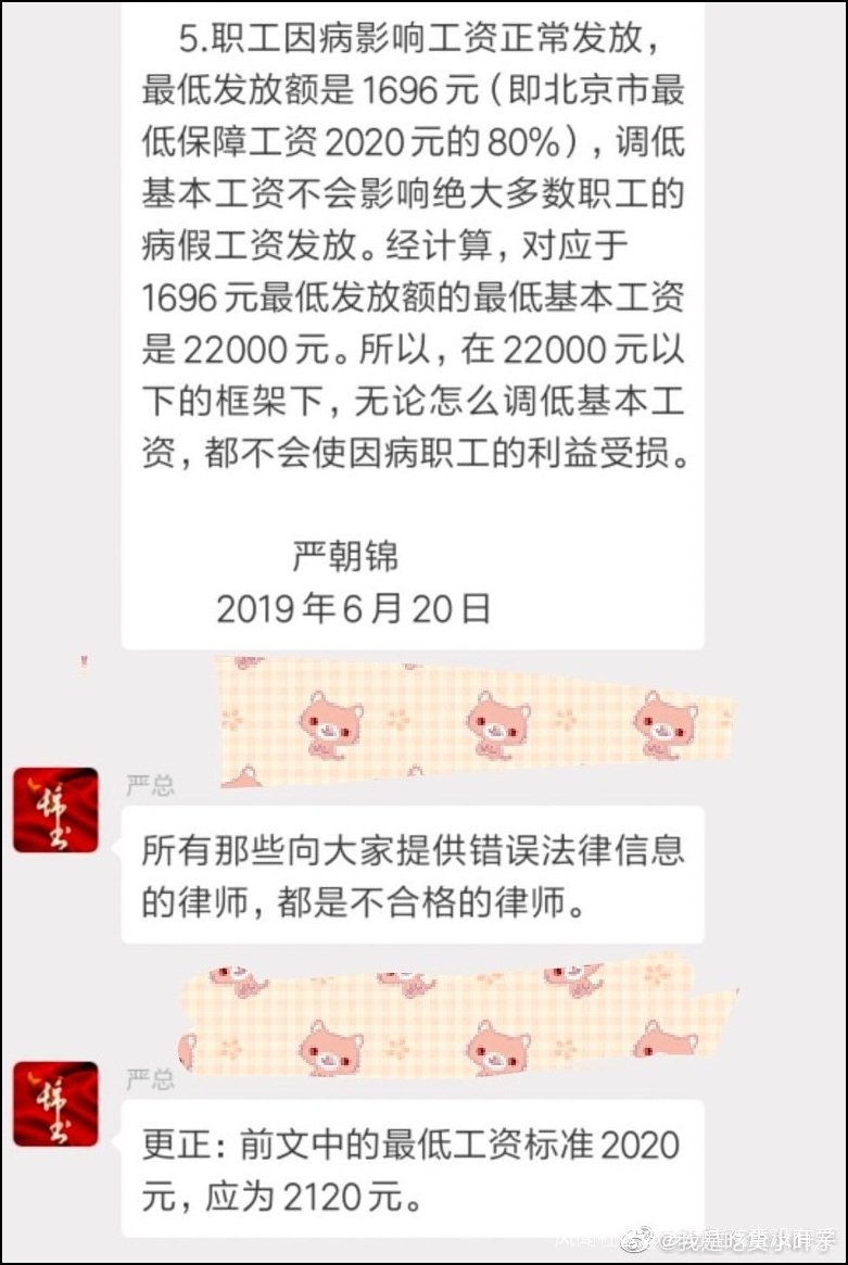 他稱,這些員工每個月的最低發放額就是北京市最低保障工資2120元的80%(原截圖其出現筆誤),即1696元。經計算,對應於1696元最低發放額的最低基本工資是22000元。在這個數字的框架下,無論怎麼調低基本工資,都不會使因病職工的利益受損。