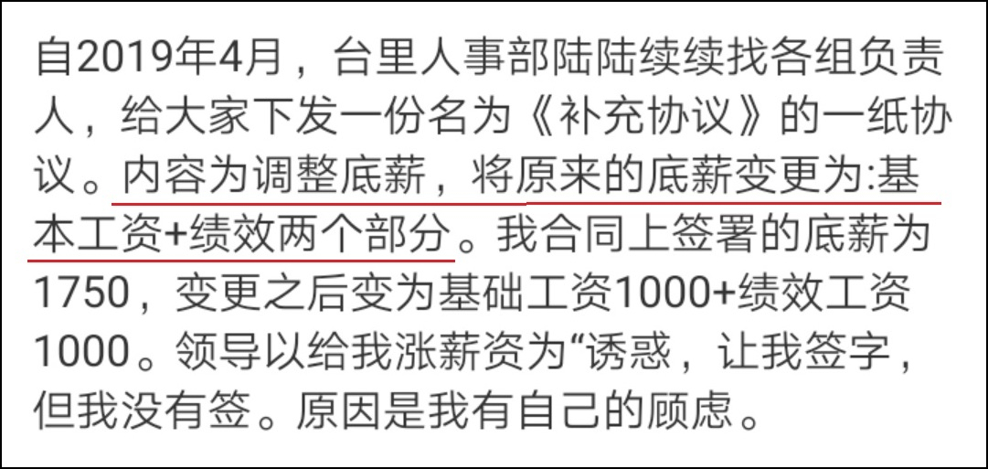 自2019年4月,台里人事部陸陸續續找各組負責人,給大家下發一份名為《補充協議》的一紙協議。內容為調整底薪,將原來的底薪變更為:基本工資+績效兩個部分。我合同上籤署的底薪為1750,變更之後變為基礎工資1000+績效工資1000。領導以給我漲薪資為“誘惑,讓我簽字,但我沒有籤。原因是我有自己的顧慮。