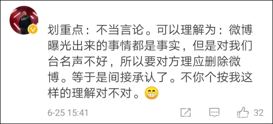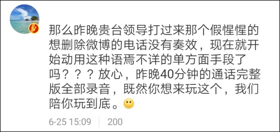 另外前幾日發的微博因為有同事有同感紛紛轉發支持,被台裏領導分別打電話責令刪除的行為,我對同事深感抱歉。也對台裏這樣的行為不予評價,只説事實。