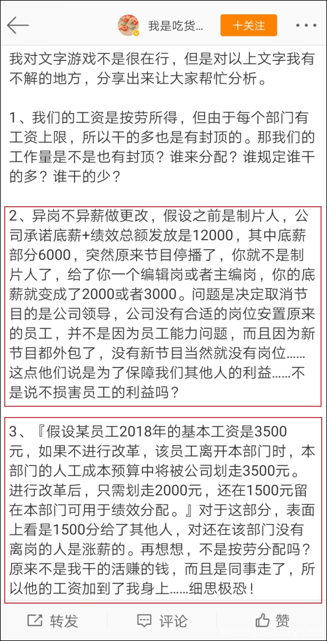 2、異崗不異薪做更改,假設之前是製片人,公司承諾底薪+績效總額髮放是12000,其中底薪部分6000,突然原來節目停播了,你就不是製片人了,給了你一個編輯崗或者主編崗,你的底薪就變成了2000或者3000。問題是決定取消節目的是公司領導,公司沒有合適的崗位安置原來的員工,並不是因為員工能力問題,而且因為新節目都外包了,沒有新節目當然就沒有崗位……這點他們説是為了保障我們其他人的利益……不是説不損害員工的利益嗎?