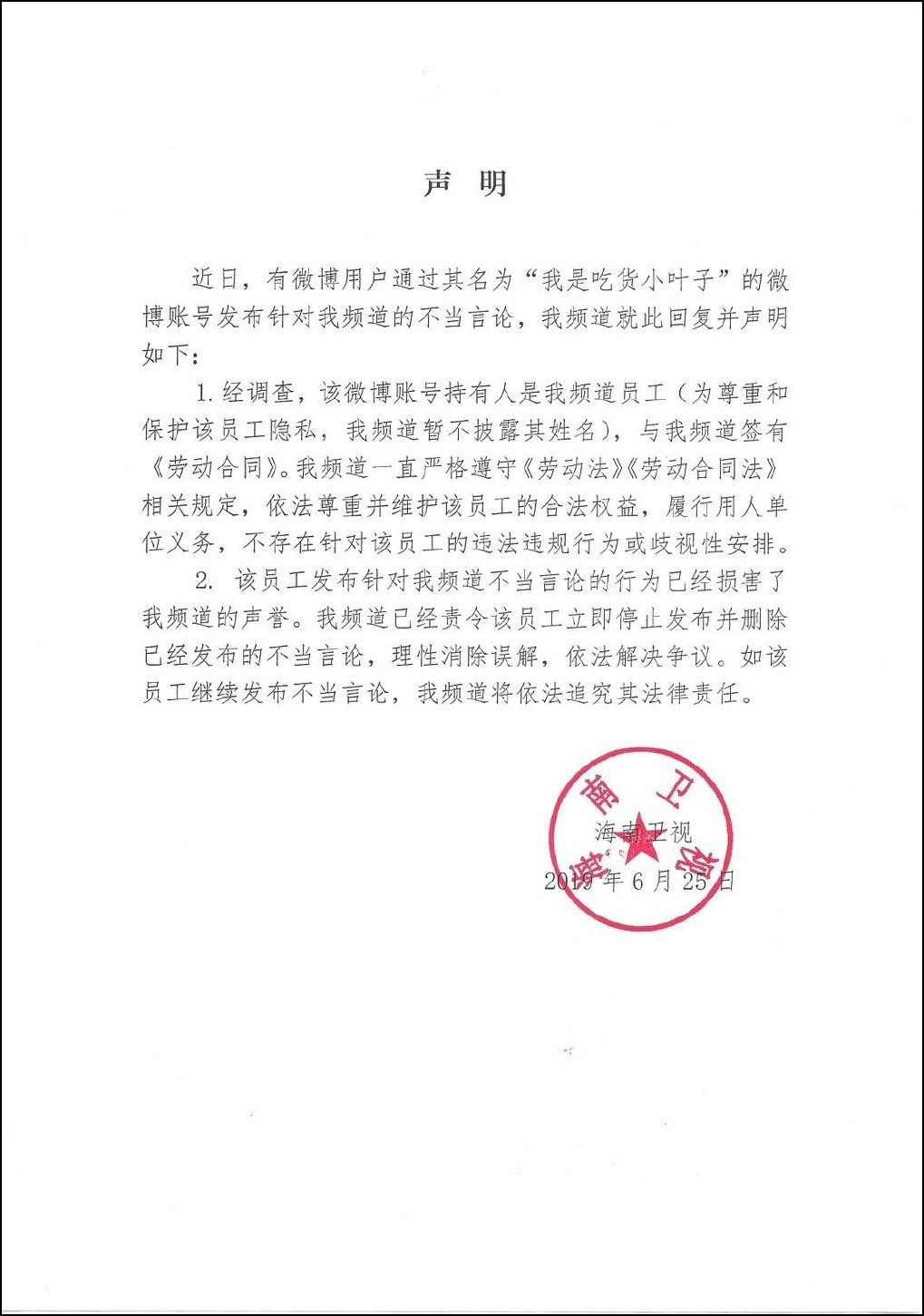 被爆惡意刁難員工,海南衞視否認!網友:你家的公章是搞笑的嗎_風聞