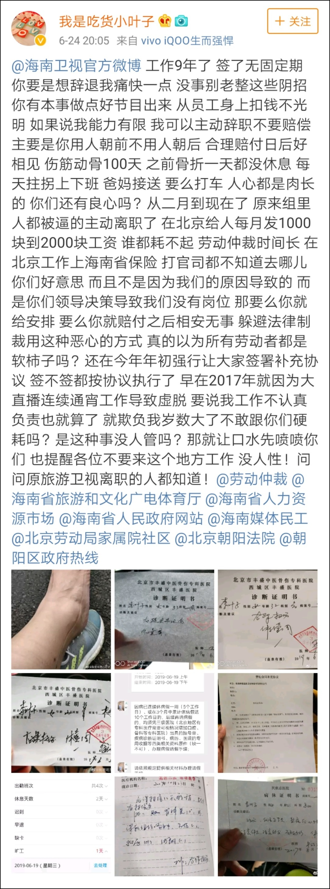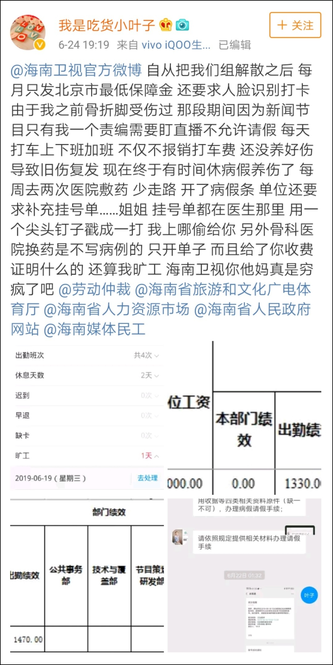 6月24日,微博認證為旅遊衞視(海南衞視前身)《城市惠旅遊》、《城市惠生活》節目編導的博主@我是吃貨小葉子(本名李葉子)連續發佈多則微博控訴海南衞視。