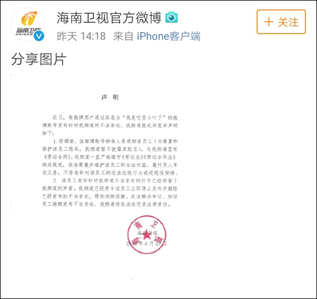 海南衞視方面承認,發文博主系頻道員工,與其簽有勞動合同。但是衞視方面一直嚴格遵守國家法律規定,依法尊重並維護員工的合法權益,履行用人單位的義務,不存在針對該員工的違法違規行為或歧視性安排。海南衞視責令涉事員工立即停止發佈並刪除已發佈的不當言論,理性消除誤解,依法解決爭議。同時,它也保留依法追究發文員工法律責任的權利。