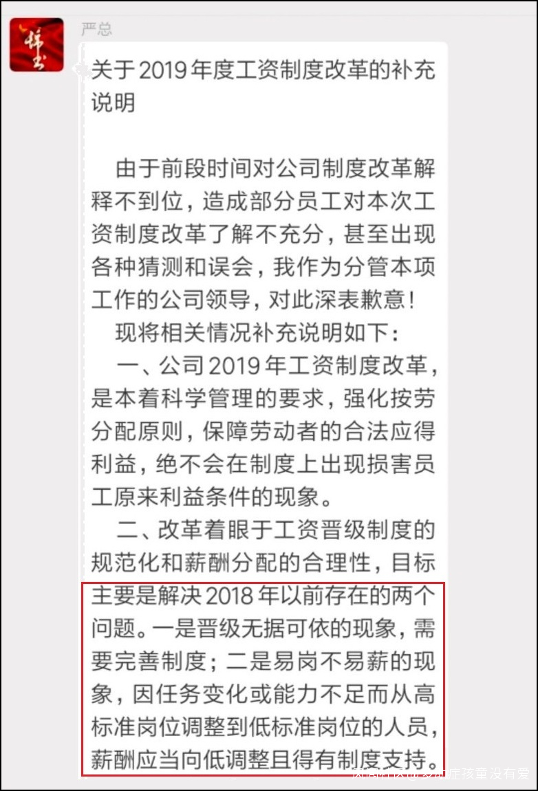 而在6月20日,台裏一個“嚴總”的負責人在工作羣中發佈長文對於薪資改革進行解釋。這位領導稱,所做出的制度改革主要是解決2018年以前存在的兩個問題:一是晉級無據可依的現象,需要完善制度;二是易崗不易薪的現象,因任務變化或能力不足而從高標準崗位調整到低標準崗位的人員,薪酬應當向低調整且得有制度支持。