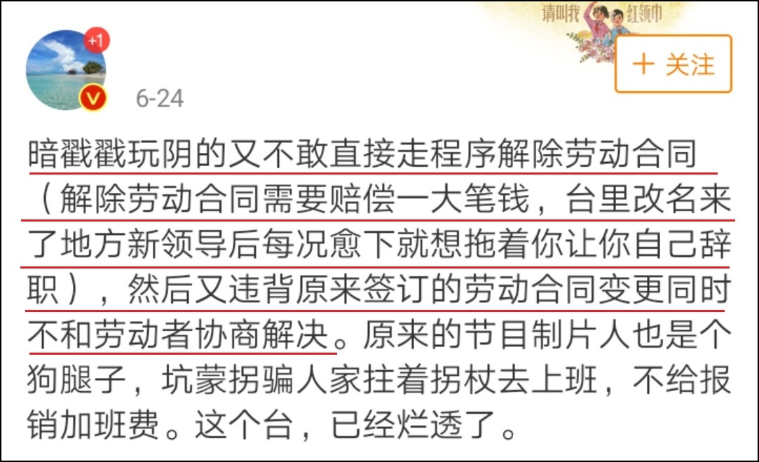 在另外一則微博中,博主稱自己與電視台簽了無固定期的合同,也為電視台工作了9年。