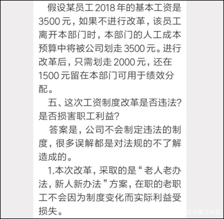 3、『假設某員工2018年的基本工資是3500元,如果不進行改革,該員工離開本部門時,本部門的人工成本預算中將被公司划走3500元。進行改革後,只需划走2000元,還在1500元留在本部門可用於績效分配。』對於這部分,表面上看是1500分給了其他人,對還在該部門沒有離崗的人是漲薪的。再想想,不是按勞分配嗎?原來不是我乾的活賺的錢,而且是同事走了,所以他的工資加到了我身上……細思極恐!