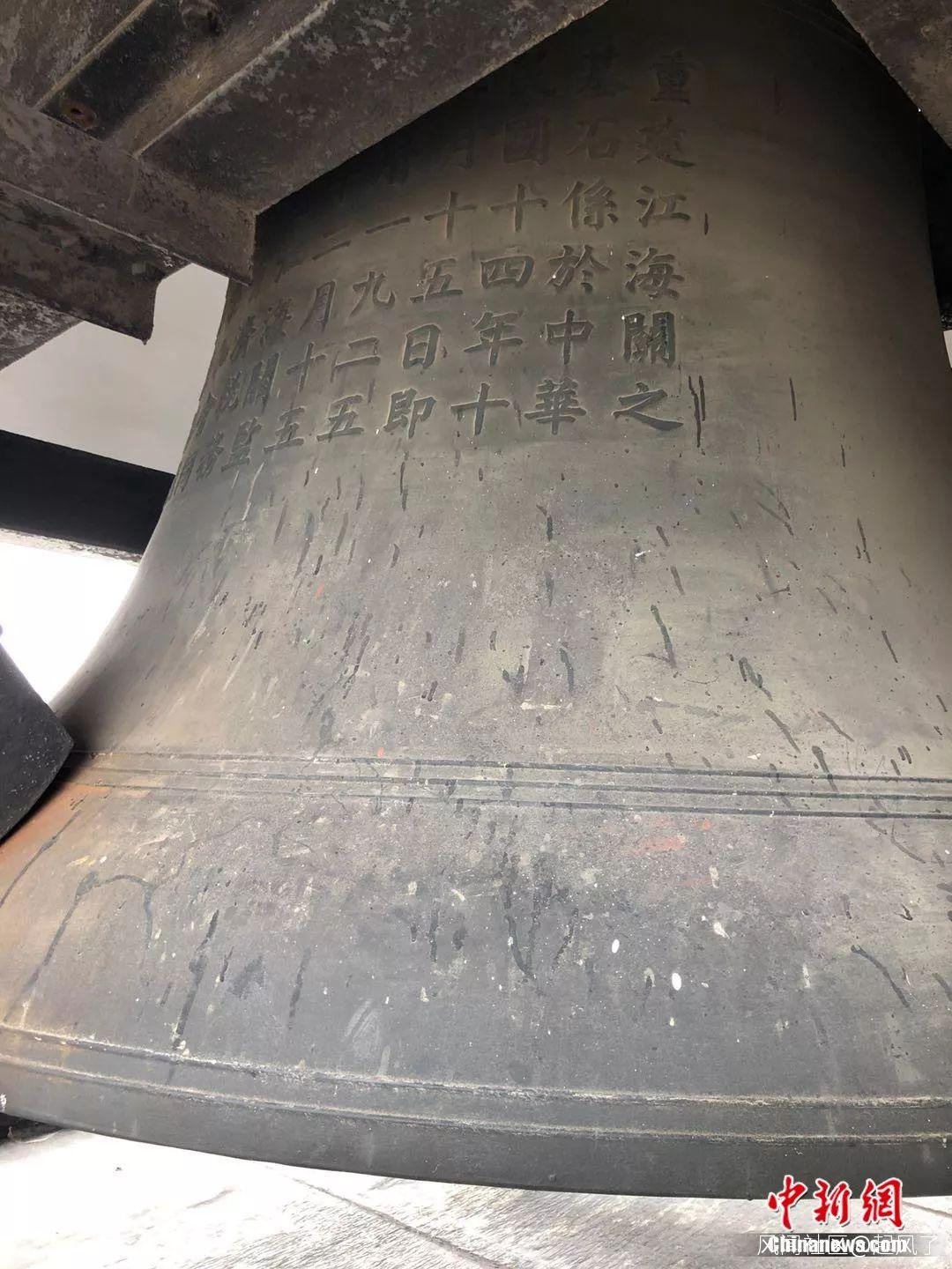 大鐘的上面還刻着銘文“重建江海關之基石……”,魏師傅介紹,這是海關大樓的銘文,一般銘文都會在樓前面,但海關大樓的銘文刻在了這口大鐘上。