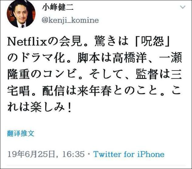 “期待三宅唱執導的《咒怨》。如果要復興日本恐怖片的話,只有Netflix能做到吧”。